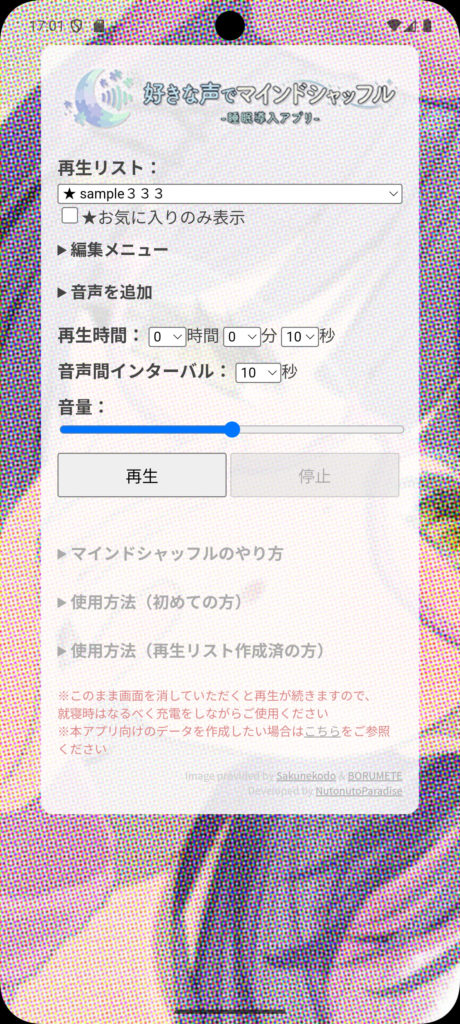 「リスト内の音声を、一定間隔でランダムに再生する」というだけの音楽プレーヤーですが、ユーザーさんが自由に音声データを追加できる拡張性が本アプリのキモになります。